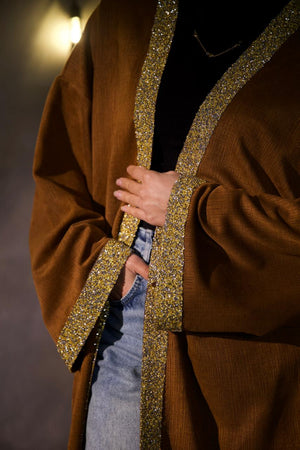 Wrap yourself in warmth with this premium Kaftan, featuring gorgeous glitter trimmed edges for that extra festive glow.